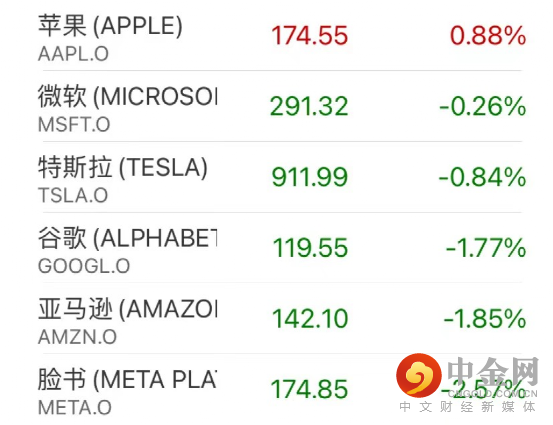 龙头科技股大多连跌两日,领跌标普。亚马逊跌1.85%,奈飞跌1.85%,谷歌跌1.77%,脸书跌2.57%,特斯拉跌逾0.8%,微软跌0.26%。仅苹果涨0.88%。