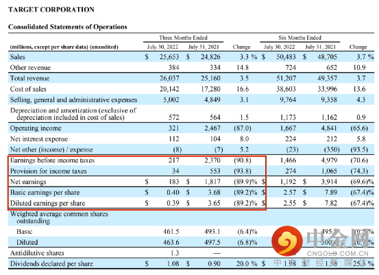 财报显示,财报显示,塔吉特二季度营收为260.37亿美元,同比增长3.5%,略低于市场预期;净利润为1.83亿美元,同比暴跌89.9%;摊薄后每股收益为39美分,不及市场预期的72美分;上年同期为3.65美元。