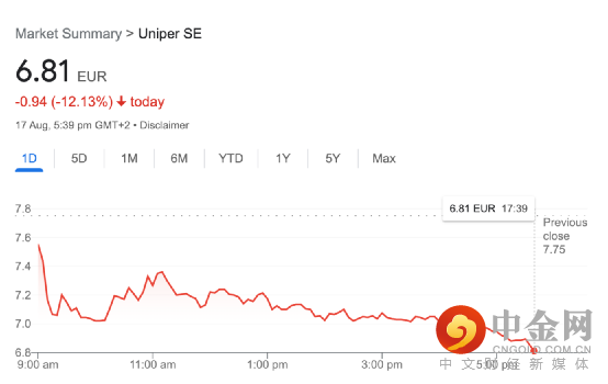 Uniper股价于今日重挫超12%。