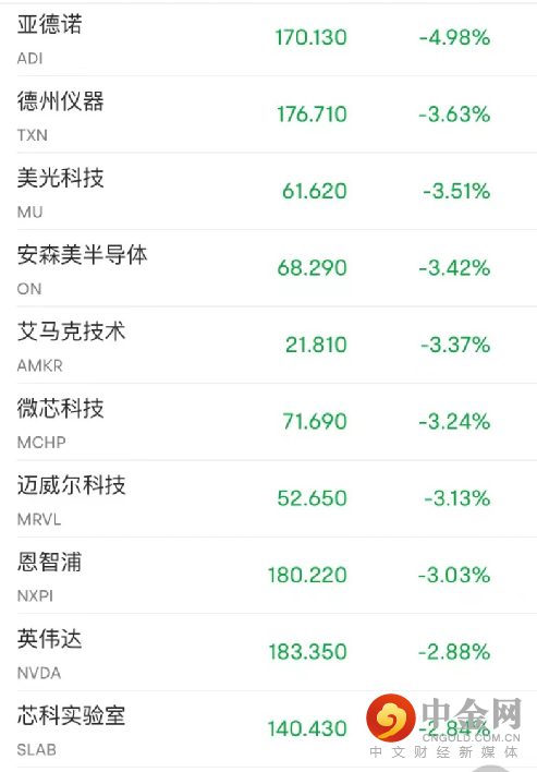 芯片股总体继续下跌且跑输大盘,英伟达跌近3%,博通、拉姆研究、应用材料跌超2%,AMD跌近2%,英特尔跌超1%,高通跌1%。