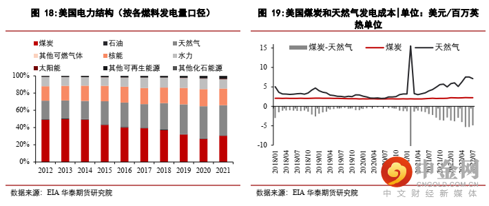 近年来,随着美国能源转型进程的推进,在其电力结构中,气电的占比正在逐年稳步提升。但在2021年,这一进程受到搅扰。由于美国天然气价格自2021年第二、三季度出现明显上涨,煤电在成本端的优势较气电更为突出,美国燃煤发电量出现大幅反弹,较2020年提升15.95%,在整体发电量中的占比也由2020年的26.81%提升至30.41%;而燃气发电量则较2020年下降4.84%,占比也由2020年的37.42%降至34.84%。