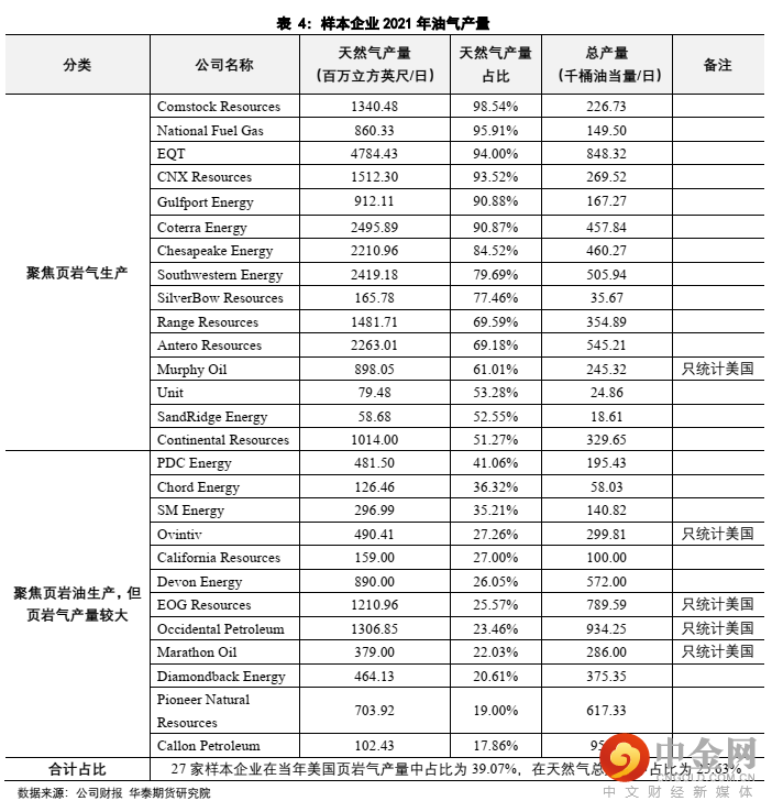 如前所述,美国页岩气产量的提升较为依赖中小型生产商的勘探开发和扩大生产的力度。参考近年来各生产商经营状况、油气产量规模以及油气产量比重,本文选取了15家聚焦页岩气生产的公司,并从聚焦页岩油生产的公司中挑选了12家页岩气产量较高的生产商,组成本部分的分析样本。(样本企业选取标准和选中样本企业见附注表格)