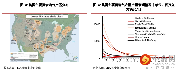 从结果来看,美国页岩气单井产量在开采一年内衰减50%-70%,开采第二年再衰减40%-60%,此后进入低产期,单井可采量在开始开采后的5-10年即被采完。因此,持续不断的进行勘探开发,对于美国页岩气保持并提升产量显得尤为关键。