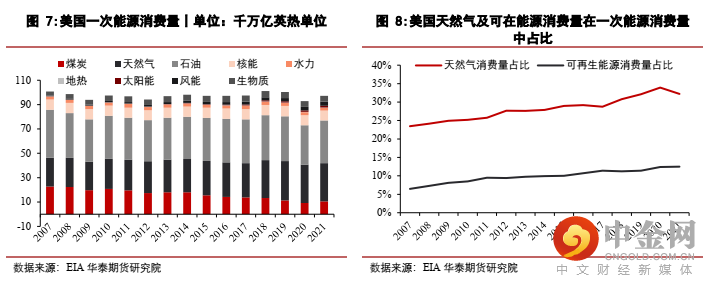 过去十余年,天然气作为相对清洁的化石能源,其“过渡能源”的作用在美国能源转型进程中发挥的十分明显,消费量在当年一次能源消费量中的占比逐年稳步提升,2021年已达到32.2%,较2011年上升6.44个百分点。但与此同时,为增强本国能源战略安全和解决环境问题,美国加快了发展可再生能源的步伐,其中以风能和太阳能的发展势头最为迅猛,带动可再生能源消费量的占比在2021年提升至12.49%,较2011年上升4.01个百分点,这已经开始对天然气的发展空间造成一定的挤占。