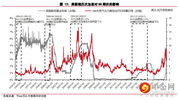 自HH期货合约上市以来,市场共经历了美联储的四轮加息周期。在这四次加息周期内,HH期价均出现了不同程度的下降。可以说,美联储的加息对美国天然气价格的抑制作用也较为明显。
