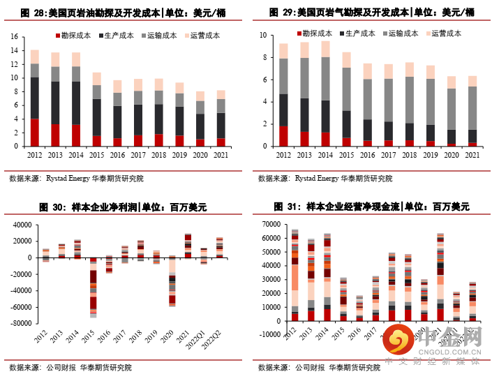 2012年以来,美国页岩油气生产技术不断革新,加之激烈的竞争和生存环境,厂商的生产成本有较为明显的下降。但是,中小型生产商业务结构单一,主要依靠销售原油和天然气获取收入,这导致其盈利状况较为依赖油气价格的涨跌。