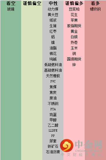 商品期货:内需型工业品(化工、黑色建材等)、贵金属谨慎偏多;原油及其成本相关链条、有色金属、农产品中性;