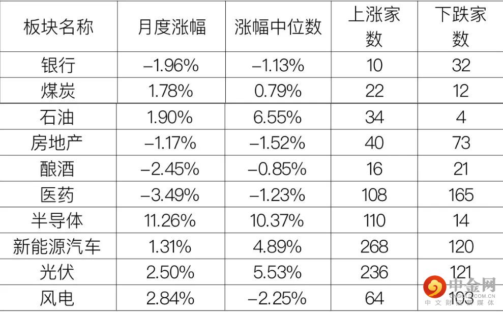主要行业的月度数据显示,在调整行情中,行业之间的分化仍然十分严重。新能源相关的板块继续保持强势。其中,半导体大幅上升,新能源汽车、光伏、风电等在上期大幅上升后继续小幅上升,而且多数个股保持着强势。而传统行业,依然是总体疲软。