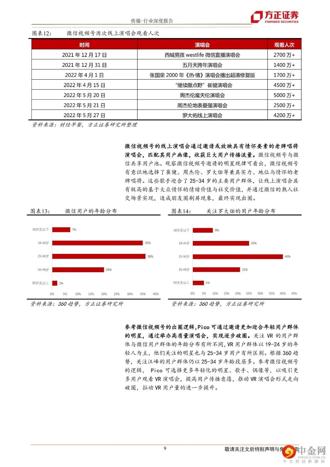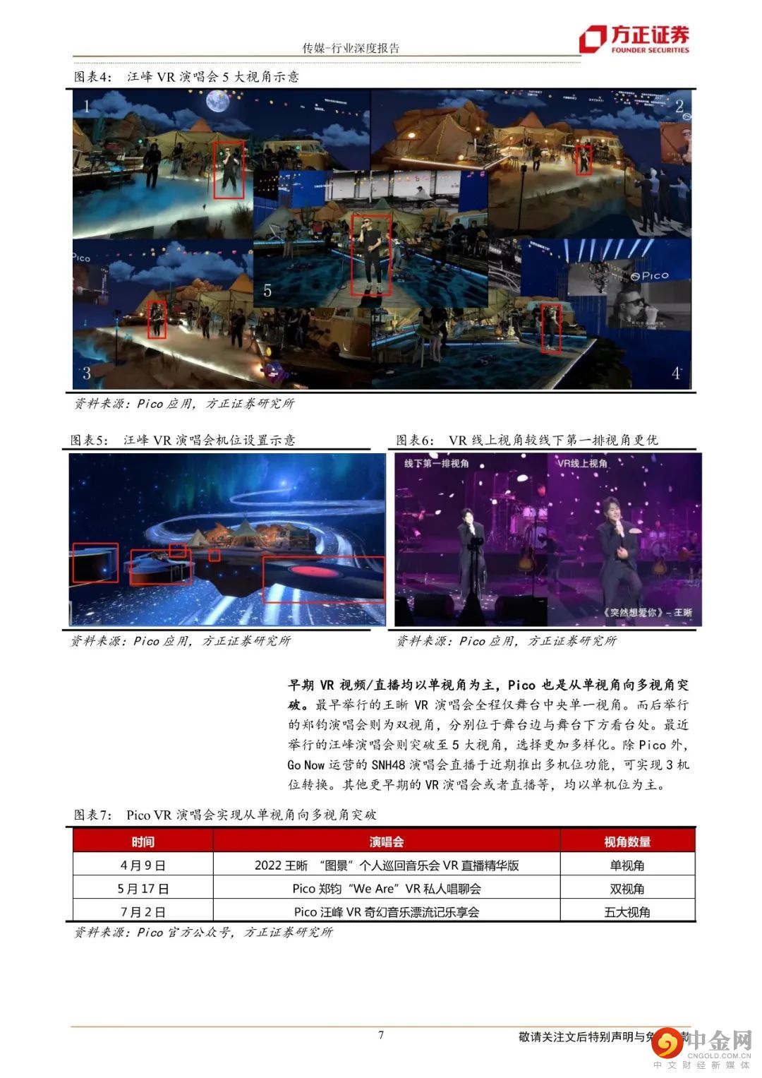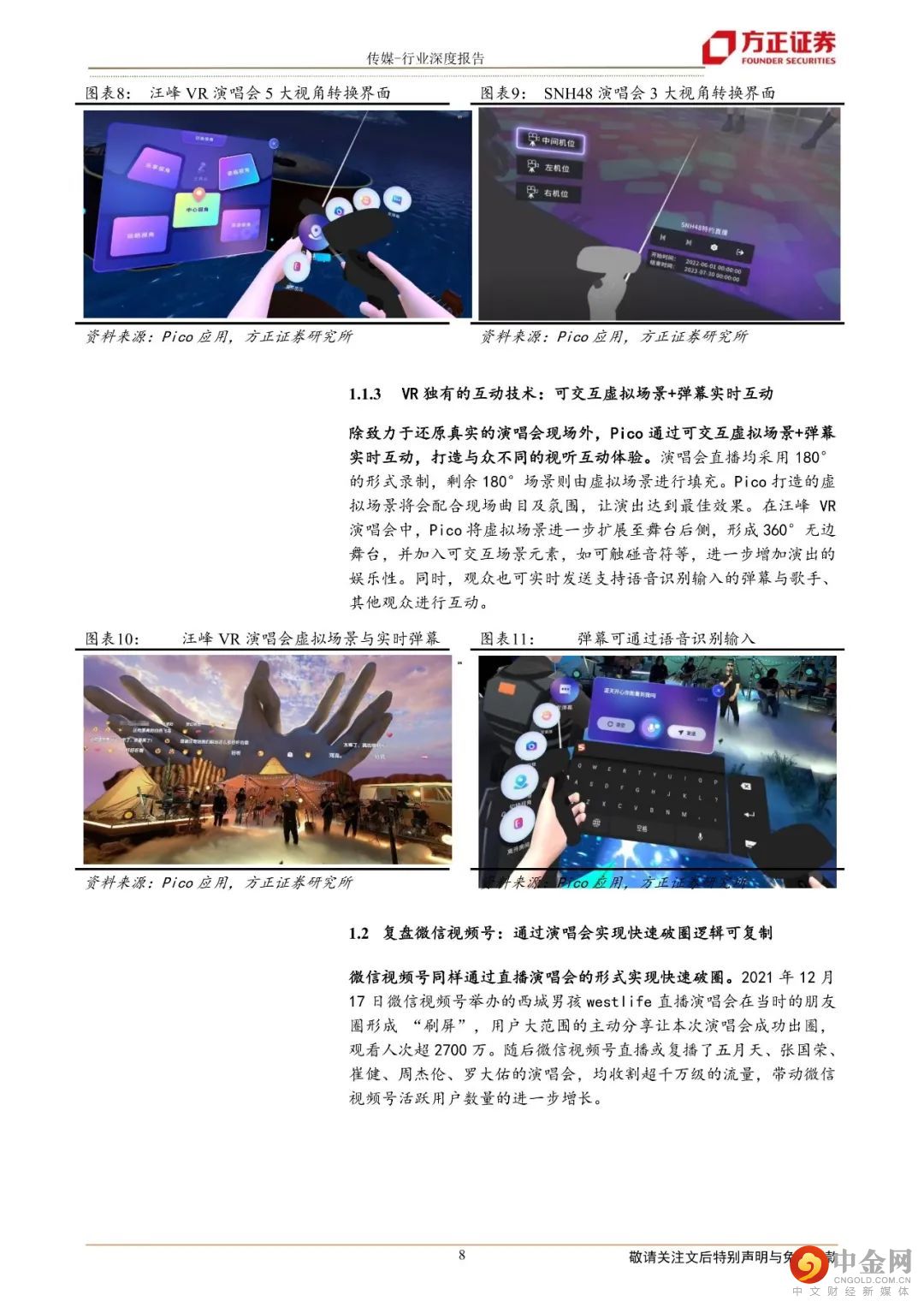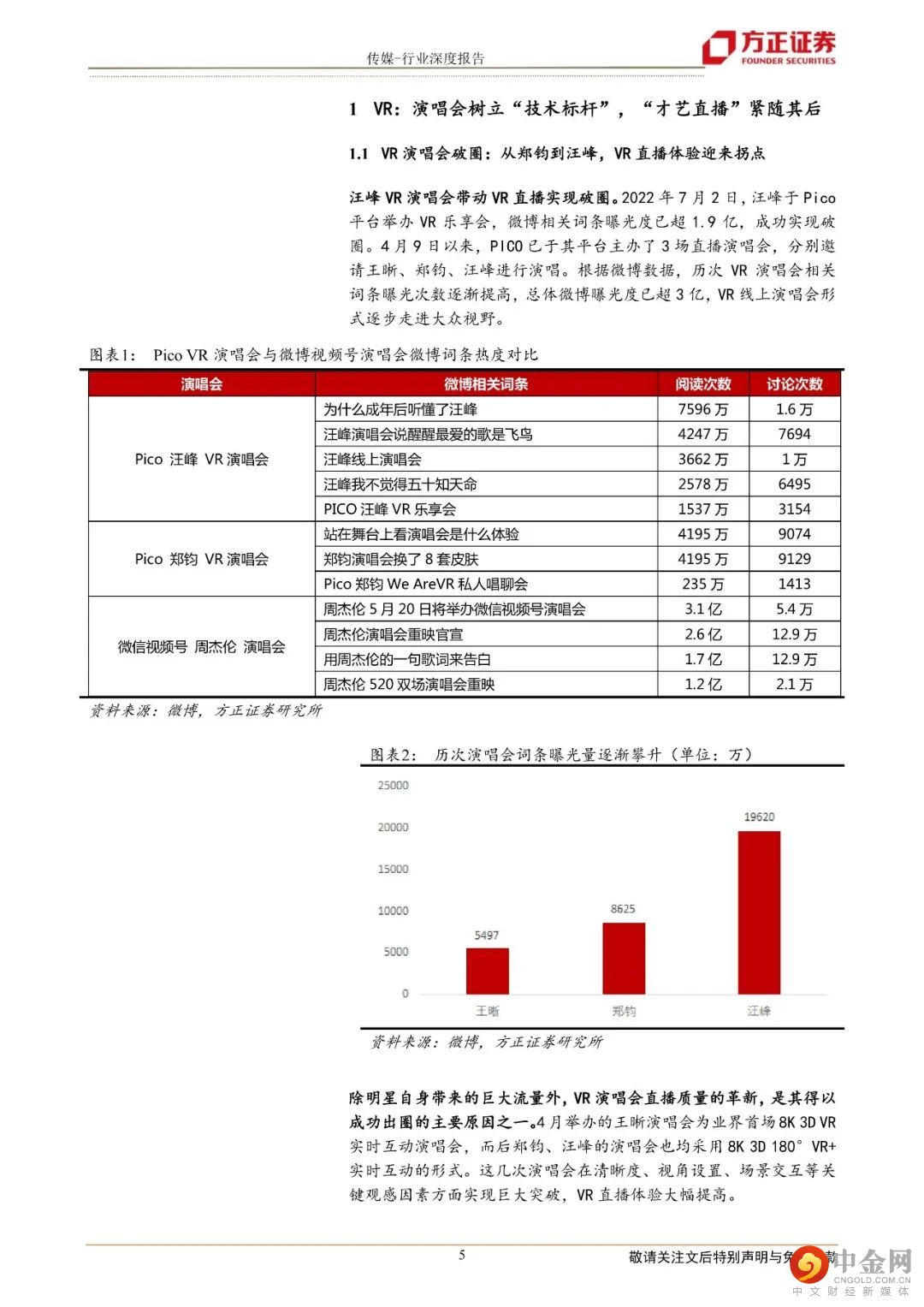 1.VR演唱会树立“技术标杆”:“才艺直播”紧随其后汪峰VR演唱会破圈:于7月举办的Pico汪峰VR演唱会微博曝光已超1.9亿,带动VR直播出圈。复盘近期3场Pico主办的VR演唱会,清晰度、观影视角、场景互动等方面为主要亮点,且效果在不断实现突破,带来全新的VR沉浸式体验。参考微信视频号,演唱会出圈逻辑可复用:对比微信视频号演唱会出圈案例,我们认为其逻辑可复用至VR直播领域,Pico可选择更加迎合其用户群体的明星实现破圈。