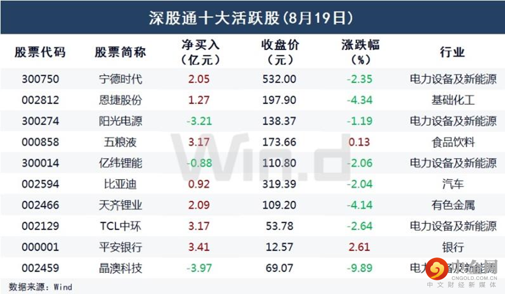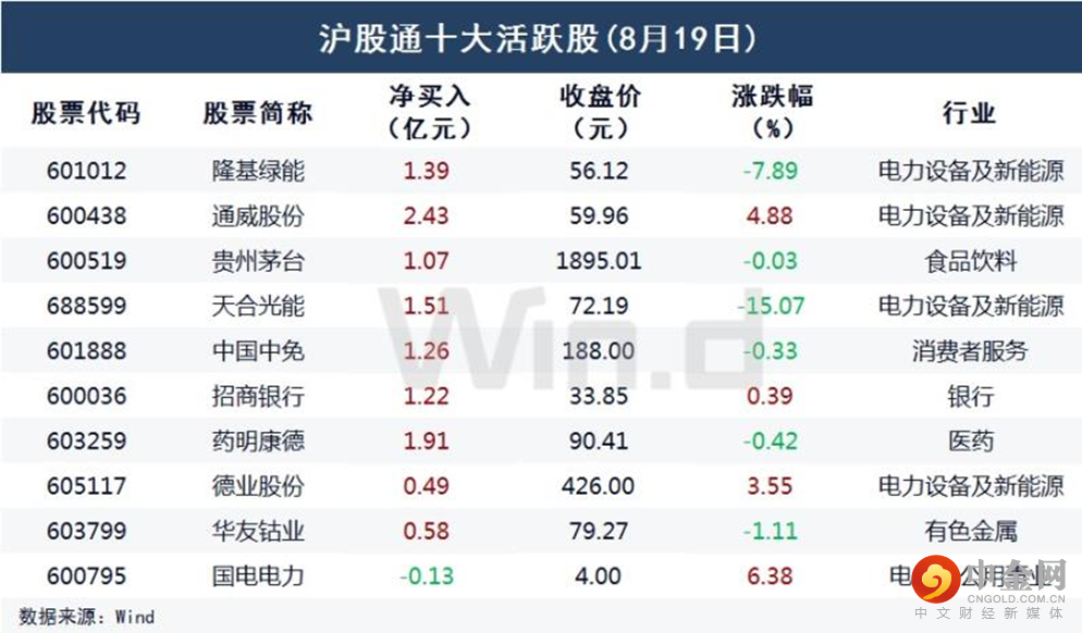 上证指数早盘窄幅整理,午后跌幅略有放大。市场交易高温干旱限电主题,而光伏龙头内卷引发热门赛道剧烈波动。宁德时代、迈瑞医疗、亿纬锂能下滑,创业板指跌超1%。大市成交1.12万亿元,上日为1.05万亿元。北向资金全天净买入17.13亿元,其中沪股通净买入26.81亿元,深股通净卖出9.68亿元。本周北向资金累计净买入近60亿元。沪深股通日内显著分化,但十大活跃股基本以净买入为主,其中沪股通仅有国电电力一股被小幅减仓。光伏巨头因硅料龙头一纸中标书引发巨震,外资加减仓不一,晶澳科技、阳光电源均被净卖出超3亿元,事件核心通威股份获净买入2.43亿元;而巨量杀跌的隆基绿能和天合光能则分别获净买入逾1亿元;此外TCL中环获净买入3.17亿元。
