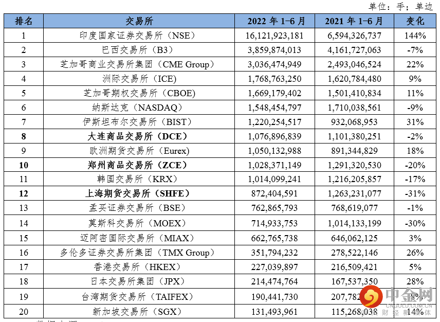 表1:2022年上半年全球成交量前二十衍生品交易所