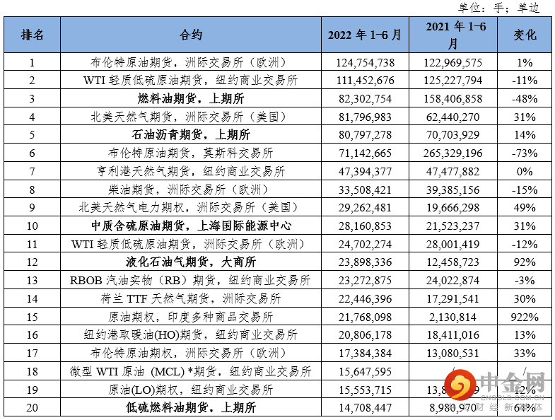 表4:2022年上半年全球能源期货和期权成交前20位