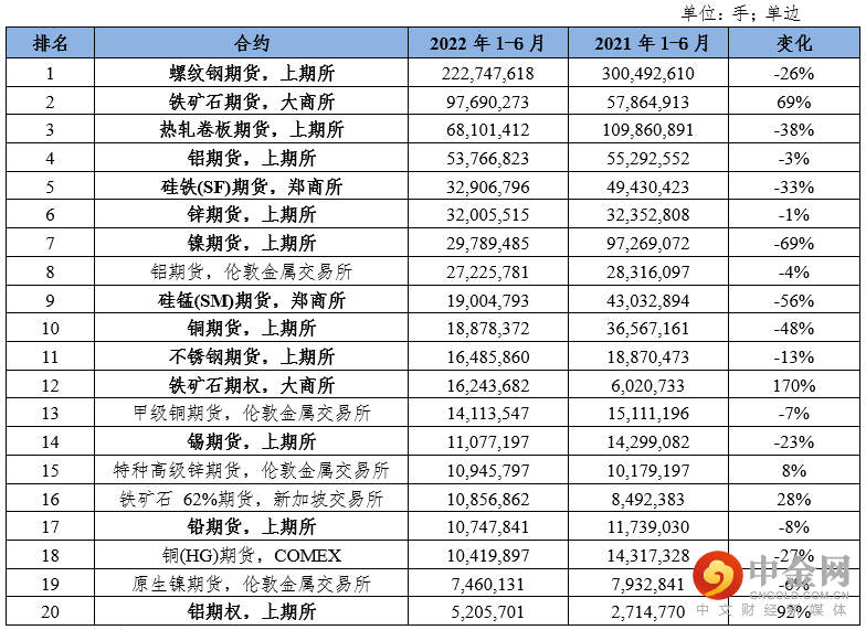 表3:2022年上半年全球金属期货和期权成交前20位