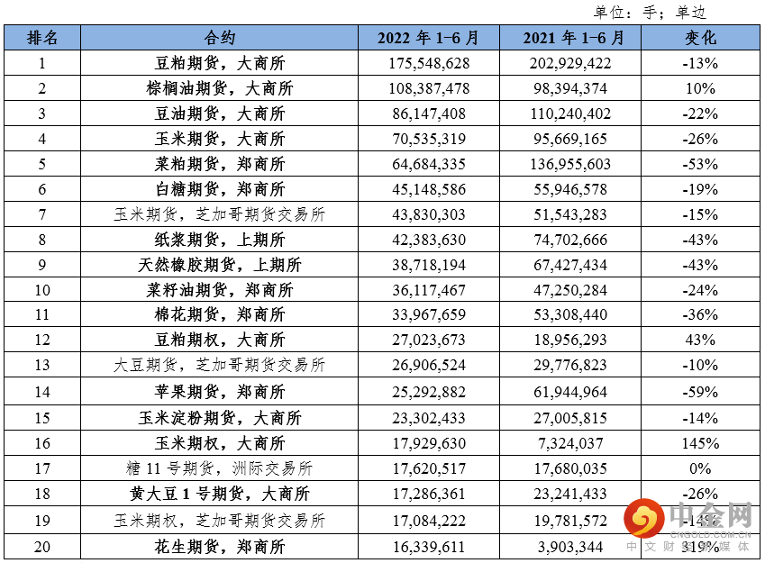 表2:2022年上半年全球农产品期货和期权成交前20位