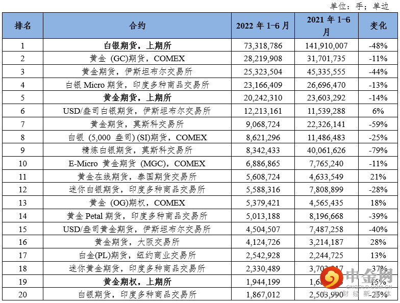 表5:2022年上半年全球贵金属期货和期权成交前20位