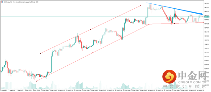 技术方面,道指(US30)目前出现动能放缓的迹象,与8月9日至8月17日之间大步前进的节奏相比,目前的K线走势反映出了更多多头交易者进入观望状态,而股指在33,850点附近出现的短期支撑线也是此刻计价水平的体现。