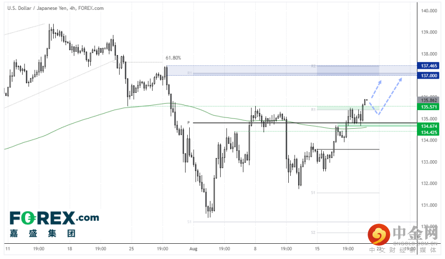 美元/日元突破至3周高点且似乎有潜力扩大反弹,4小时图处于上涨趋势中,并在月图中枢位、134.67高点和200期指数移动均线附近形成波段低点。理想情况下,价格应该可以守住周图第一阻力中枢和135.57高点再继续冲高,但如果回落至前述支撑区域下方,我们会寻找135.0上方形成上抬低点的证据。