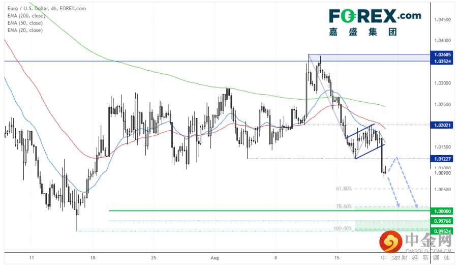 欧元/美元昨天突破看跌旗形后看起来极有可能回到平价,4小时图已形成强跌势,目标0.9976附近,期间可能指向落在78.6%回档位附近的平价。受制于1.0202高点继续看跌,但如果价格先回调再续跌势,则我们选择在反弹至1.0122低点后逢高沽出。
