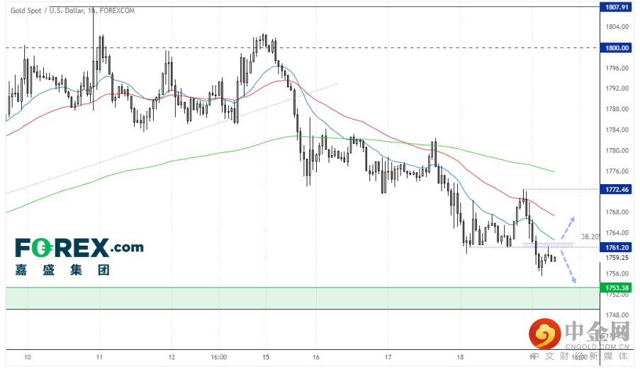 金价先是一反昨日向下势头冲高,后因美元大涨而调头向下,现已创下周期新低并确认了1761低点的阻力地位。小时图在阻力处,也就是略低于38.2%回档位的位置形成看跌锤子形态。
