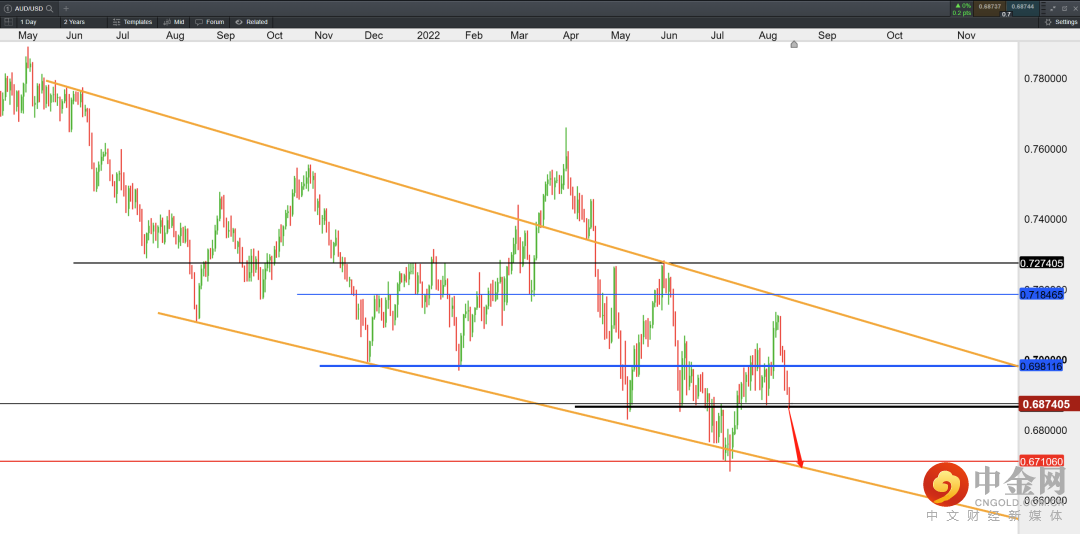 澳元兑美元受强势美元影响大幅度下跌,价格或延续震荡下行通道运行。美联储料坚定鹰派立场促使美元走强,非美货币或集体承压。目前关注0.687能否企稳,若失守该价格,或进一步下行至0.67。