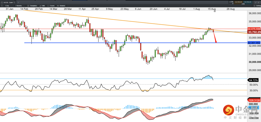 RSI指标日线超买并呈现背离,MACD指标有形成高位死叉迹象,投资者可关注下方的第一支撑位32350。