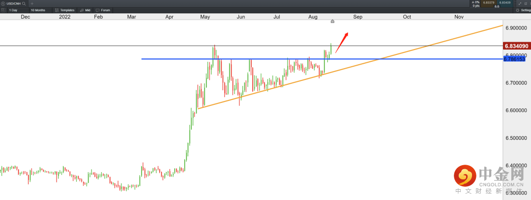 美元兑人民币突破上升三角形结构,站上6.8,技术面上价格或进一步向上延伸。