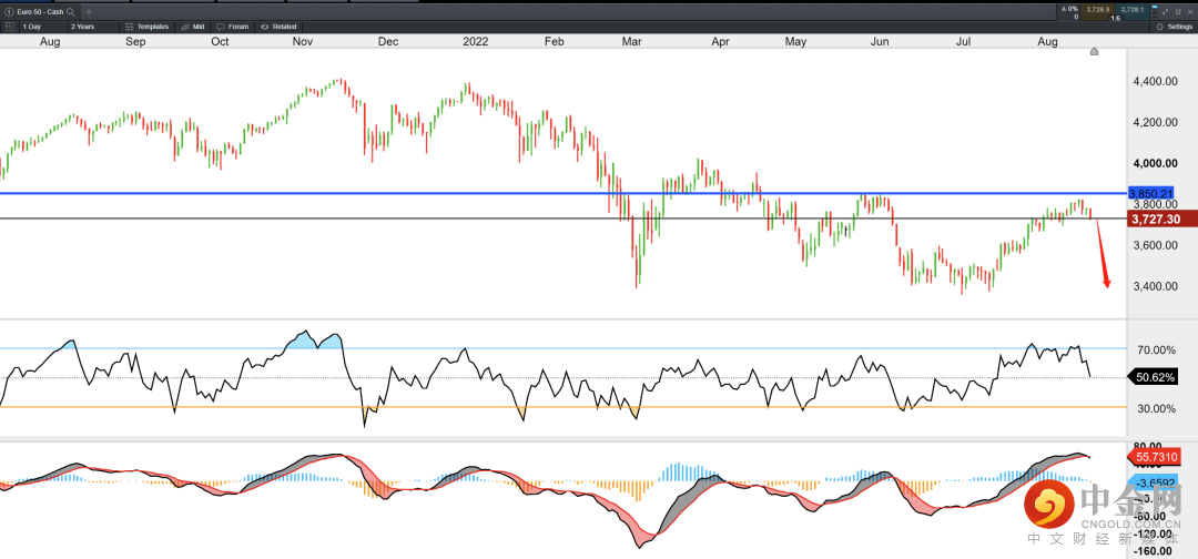 欧洲斯托克50指数在3800承压回落,RSI指标呈现背离,MACD指标有形成死叉迹象。由于欧洲能源紧缺问题料在秋冬季加剧,或推升欧洲通胀进一步攀升,欧元区经济前景悲观。欧洲央行或采取连续50个基点的加息以抑制通胀。欧洲斯托克50指数或将结束反弹。下方目标:3400