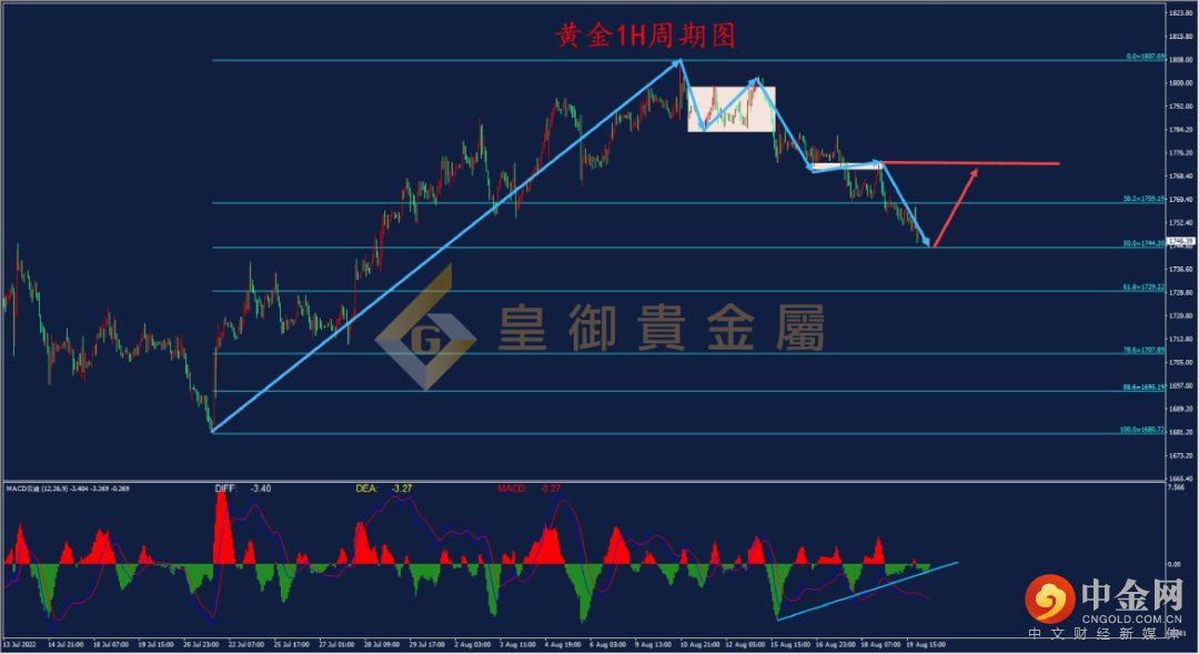 在美元强势上涨的打压下,黄金近日连续下跌。从1H周期走势结构看,黄金自1807.0附近下跌,目前已跌至前期上涨段50%位置1745.0附近。50%为黄金分割线重要比例位置,通常有较强作用。结合MACD指标来看,价格连续下跌,但DIFF线与DEA线并未创出新低,绿色能量柱面积也在逐渐缩小,表明空头力量不足,黄金在1745.0附近企稳概率较大,日内可在此位置尝试多单。