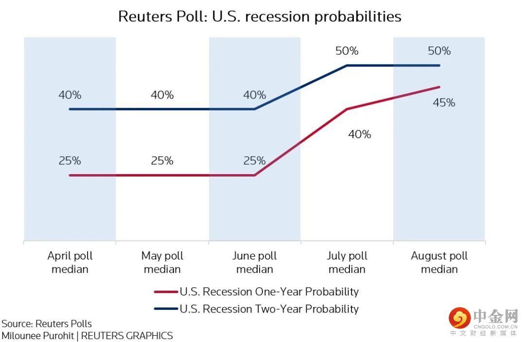 路透社的调查显示,经济学家们预计未来一年将发生经济衰退的概率中值为45%、高于7月份调查时的40%,预计未来两年发生衰退的概率中值为50%。