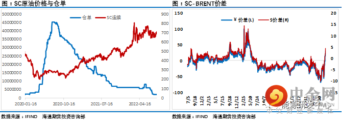 可以看出SC原油的理论成本中核心因素中东原油和运费都是导致SC原油大幅走强的重要原因。而从期货盘面上还有一个让SC原油强势的条件,SC原油仓单降到了历史低位只有197万桶。在2020年8月SC原油注册仓单突破了4500万桶到了峰值,这推动了SC原油对国际油价的持续走弱从升水结构转成贴水国际油价,持续了近2年时间,随着仓单随后不断减少到低位意味着对SC原油来说交割压力较小,在大宗商品普遍走弱的背景下,也进一步吸引了资金多配SC的策略。