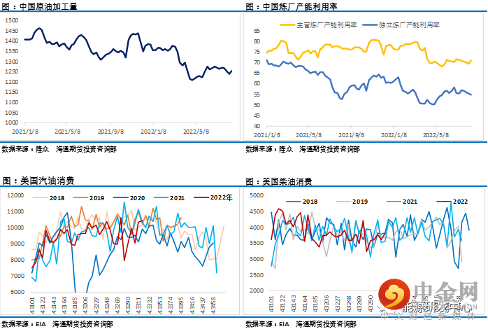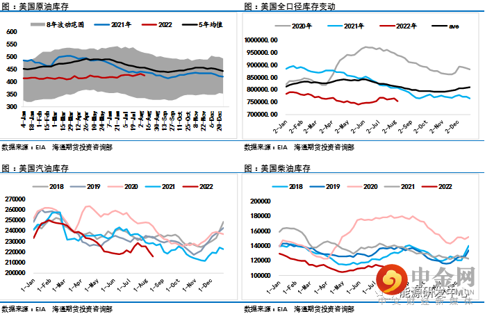 年中开始的此轮回调行情其中主要的下行推力是源于全球经济衰退风险及原油需求端不及预期的表现。尤其是需求端恢复不及预期在很大程度上缓解了供应紧张的压力,这也让原油市场一直强势的月差结构在7月之后快速回落,尤其是WTI原油月差结构主次月一度接近平水,从EIA的短期能源展望来看2022年的累库预期主要集中在三四季度,这也是过去一段时间以来油价持续下行的关键原因所在,如果后续数据累库如期落实,油价将持续因此承受一定压力,这会限制油价的上行空间。