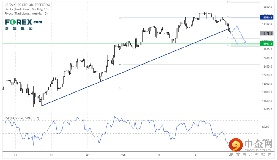 纳斯达克100指数打破了上涨趋势线,暗示正在回调。但RSI14超卖,价格在扩大下跌前或有潜力先构筑波段低点。所以,我们认为价格可能摸至周图枢轴位(黑色线)甚至13,556阻力,然后可能展开新一轮跌势。短线下跌目标在12,943附近 的支撑区域。