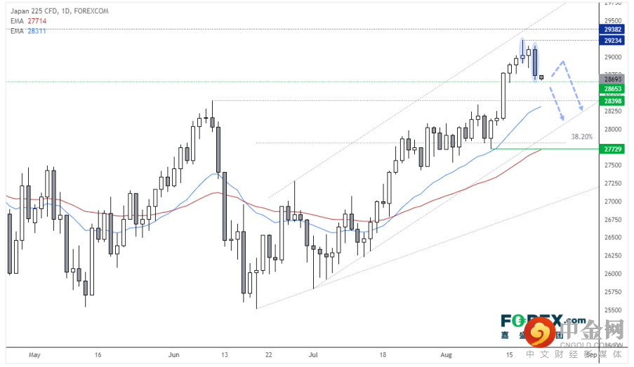 日经225指数终于在上周走出我们所预期的回归均值行情,周图形成看跌锤子形态。日图形成了看跌锤子和看跌吞噬K线,暗示价格现正对上涨趋势展开回调。受制于上周高点继续看跌,可能考虑在上周五区间内展开小级别反弹时逢高沽出,目标上涨通道的下轨趋势线。