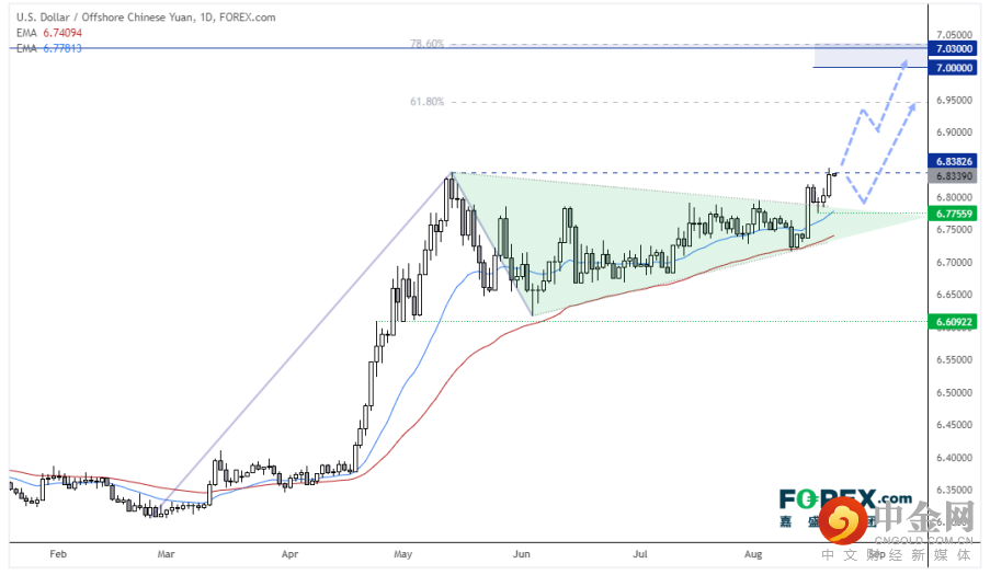 美元/离岸人民币日图打破了大型对称三角形,且似有潜力摸至7.000。在突破三角形后出现的小型回撤,表明价格已在6.7756构筑重要的波段低点。所以,守住该位我们继续看涨。价格在上周五盘中突破5月高点,如果收于其上,可假设延续涨势。