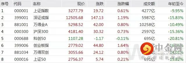 周一,A股强势反弹,截至收盘,上证指数涨0.61%报收于3277.79点;深成指涨1.19%报收于12505.68点;创业板指涨1.64%报收于2779.02点,万得全A总成交1.03万亿。