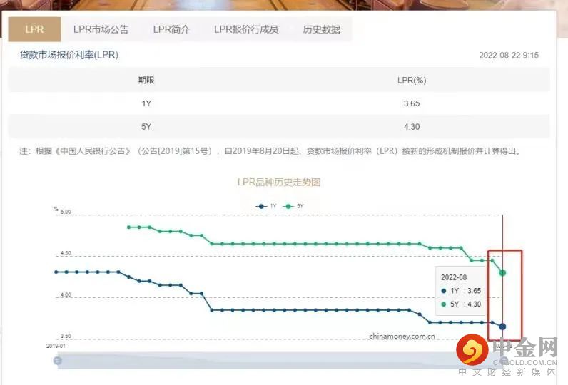 8月22日,中国人民银行授权全国银行间同业拆借中心公布,8月22日贷款市场报价利率(LPR)为:1年期LPR为3.65%(上次为3.70%),5年期以上LPR为4.3%(上次为4.45%)。以上LPR在下一次发布LPR之前有效。