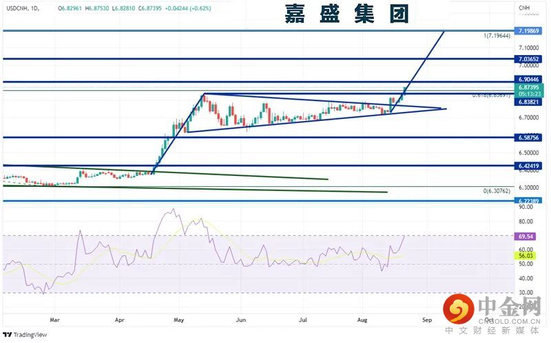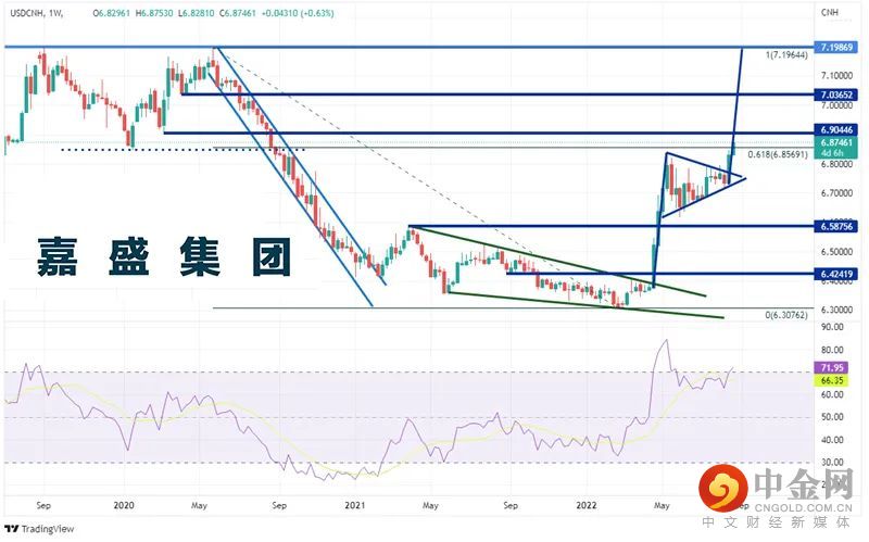 美元/离岸人民币周图在2020年5月于7.1965附近形成双顶,后于当年8月底下破颈线并有序下跌,于2021年2月8日当周跌至6.4126,接下来的一年里开始进入略微向下的横盘行情,并形成下降楔形,最低跌至6.3087。但美元/离岸人民币在2022年4月大举上破此形态,逼近双顶高点到2月低点行情的61.8%回档位6.8569附近,之后盘整并形成了三角旗,直至上周站于其上。本周开局多头胜出,价格站上6.8569并逼近形态目标,即2022年5月高点7.1964附近。