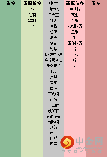 商品期货:内需型工业品(化工、黑色建材等)、贵金属谨慎偏多;原油及其成本相关链条、有色金属、农产品中性;