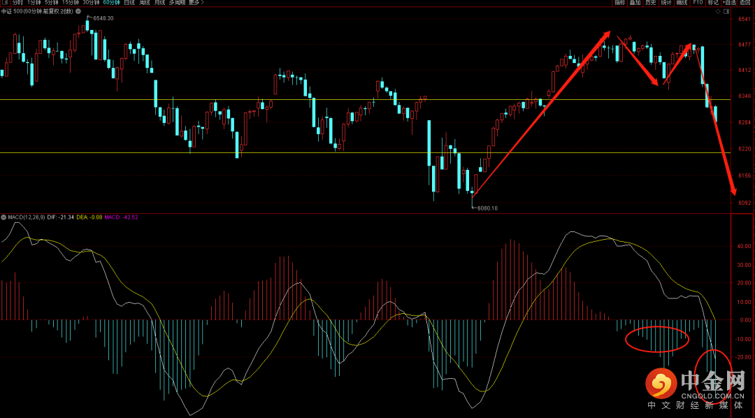 中证500六十分钟出现双顶结构,短期大概率会再次向下回到前期平台中枢下轨6100附近,而这个位置如果出现的反弹无法突破6350则大概率还会出现新的一段调整下跌走势。