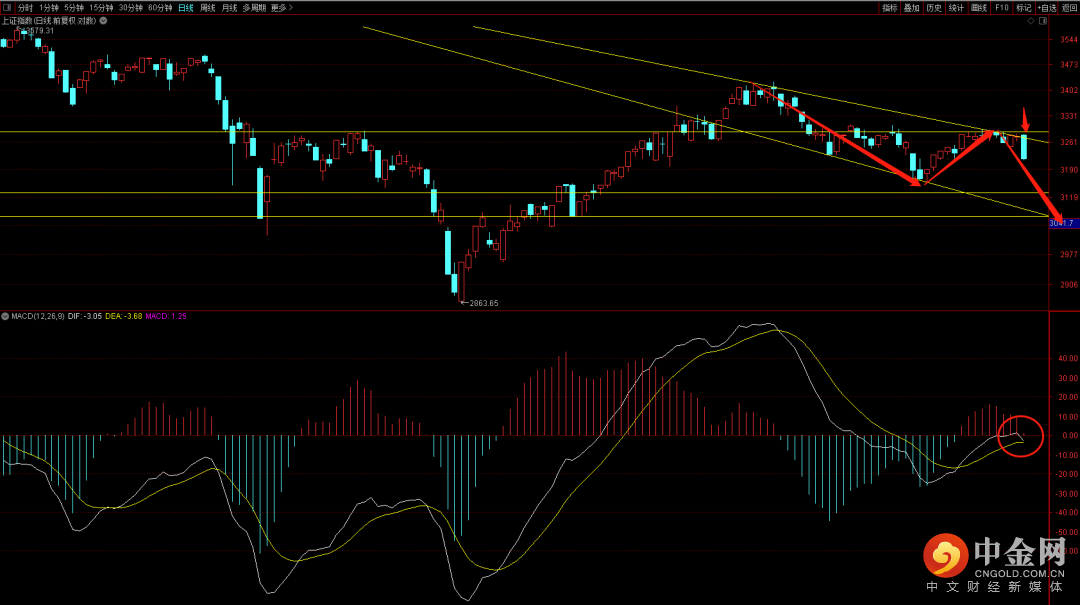 大盘在高开后上冲日线下降趋势线后受阻回落,短期出现一阴穿多线走势,这个结构代表着后续大概率还会有向下动能,目前五分钟有出底分迹象,注意观察周四是否有回升,如果无法突破3260大概率还会有继续向下,关注前期平台3100到3155点支撑。