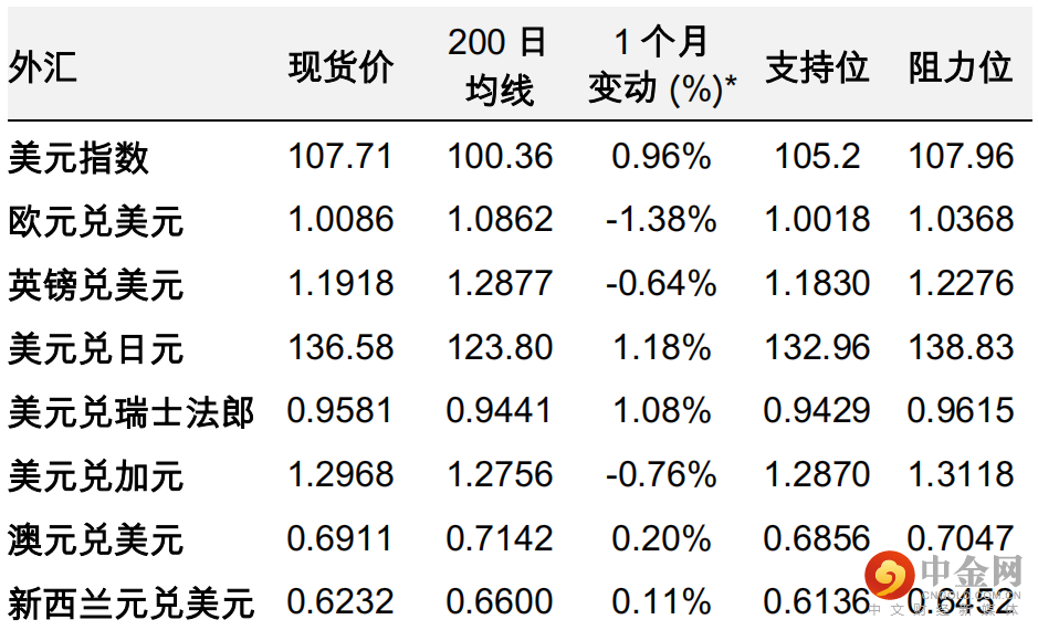 | 美元 | 市场将关注美联储8月25-27日的杰克逊霍尔经济研讨会。由于美联储主席杰罗姆·鲍威尔(Jerome Powell)预计会发出还有更多工作要做的明确信号,并反对市场有关2023年将降息的预期,因此我们认为美元将继续走高。美国经济数据仍将是关键,包括8月ISM数据(将于9月1日公布),尤其是8月就业和通胀数据(分别将于9月2日和9月13日公布),然后是9月20-21日的联邦公开市场委员会会议。我们预计美联储主席鲍威尔将会老调重弹,且市场对于加息50个基点还是75个基点的预期比较均衡,这些理由都支持美元横盘整理。然而,我们认为其他因素,例如上调新政策利率中值预测(尤其是调高终端利率预测),可能足以推动美元上涨。由于全球经济放缓,避险情绪料将维持高位。因此,我们预计,美元将会在未来几周受到利率和避险情绪的双重支撑。 | 美元指数^ | ↑ | ↑ |