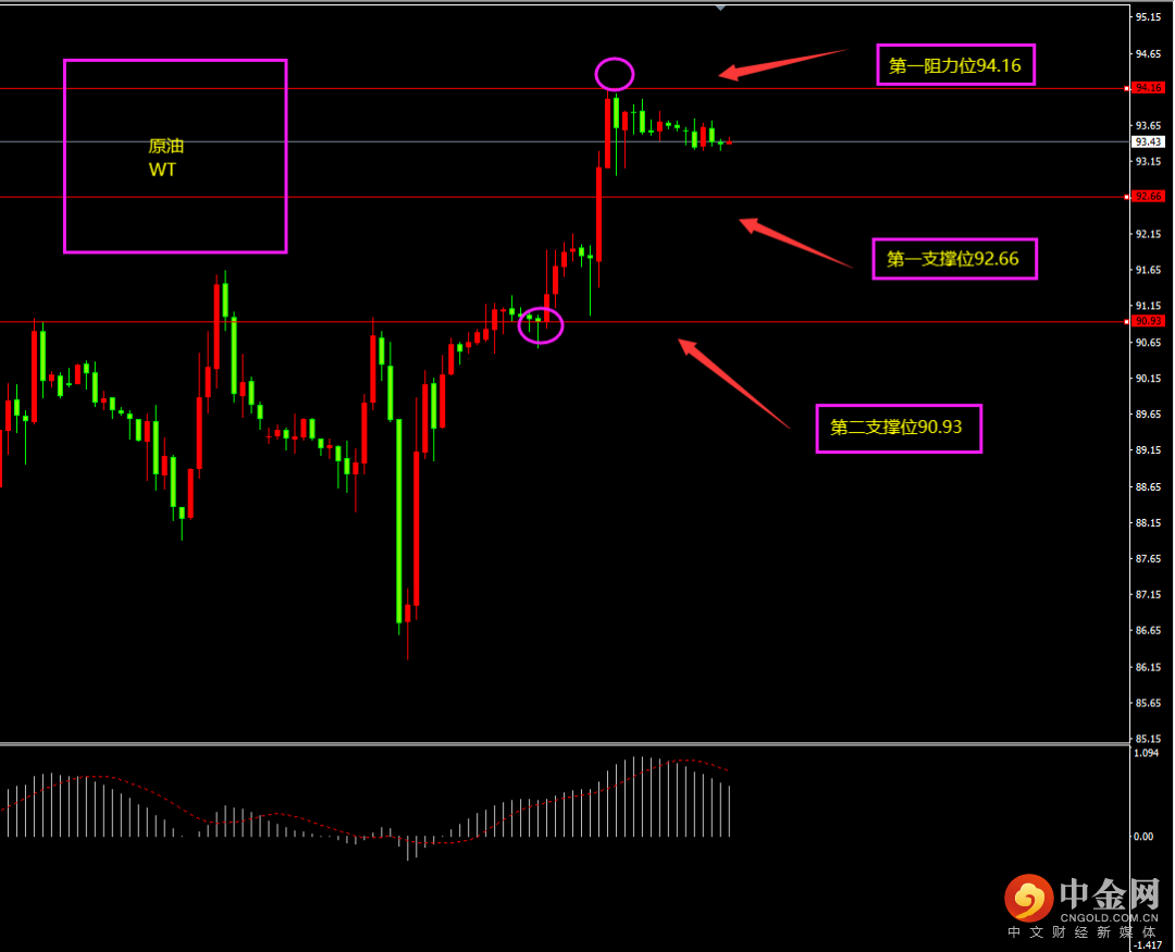 原油昨日收大阳线,价格大幅冲高,多头表现强劲,短期MACD逐渐上移,空头有所减弱,日内更多以震荡以及震荡上行为主。小时图原油期间连续阳线突破震荡高位,MACD位于0轴之上,多头占优,短期上方无大阴线下滑,空头不强,只恐日内或继续冲高?(大阴线不出,空单不入)