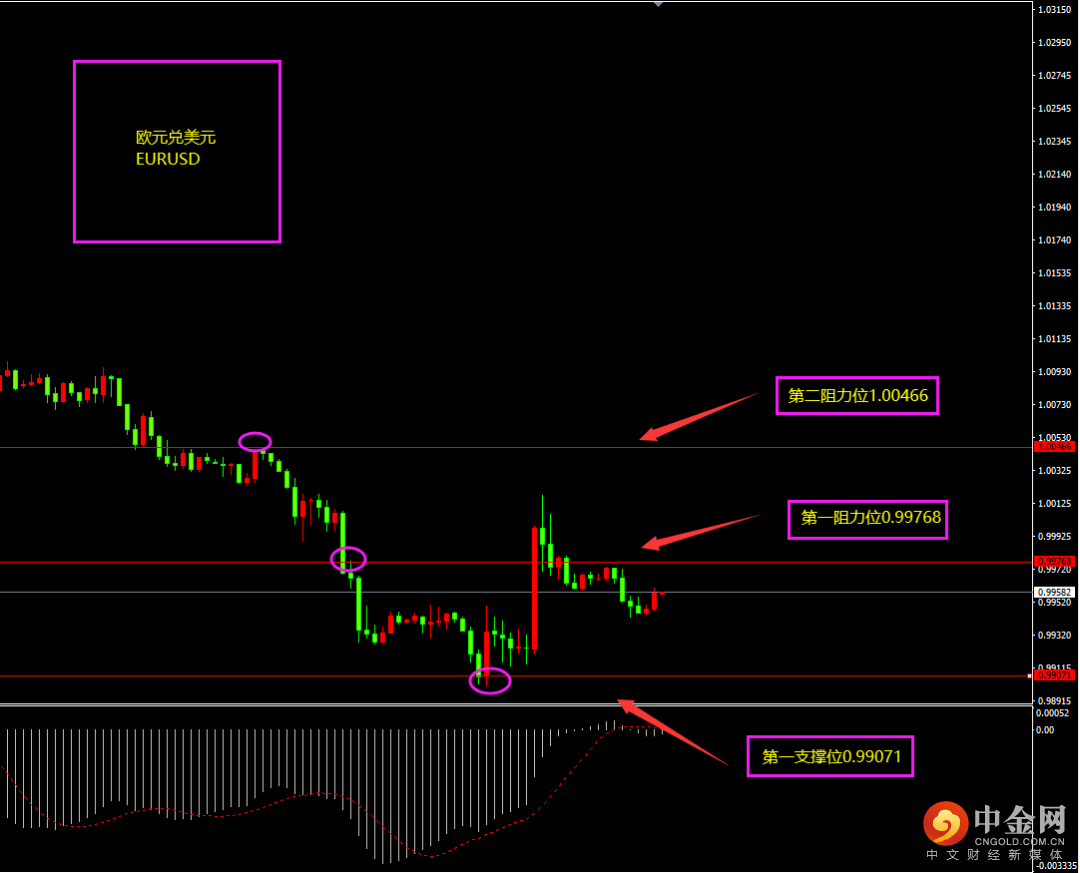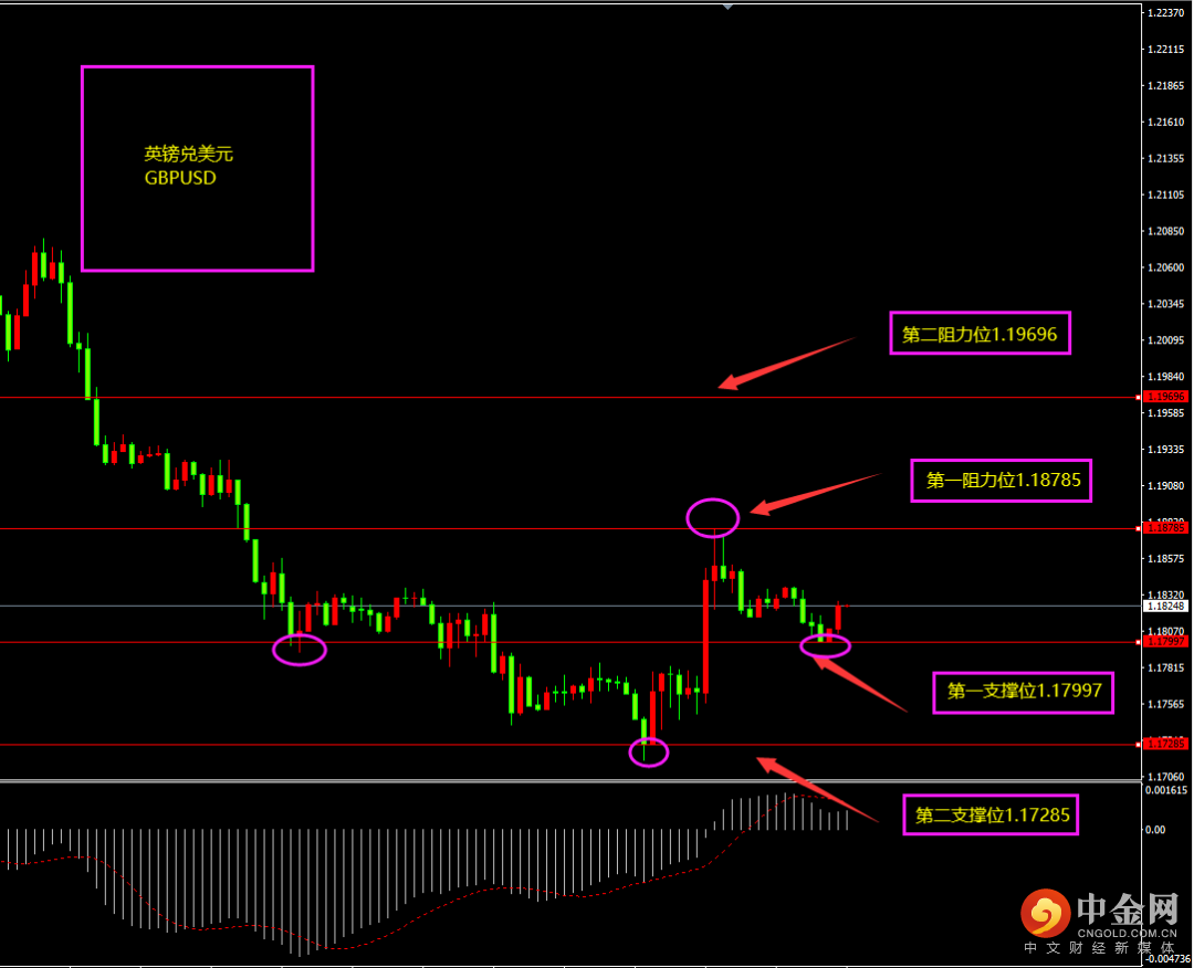 天图欧元收阳线,上下影线较长,价格曾一度回落之后快速反弹,下行空头遭受多头反扑,且底部形成底背离,多头有所增强,日内更多以逢低看多为主?小时图欧元期间有大阳线筑底,MACD位于0轴附近,多头占优,短期上方有连续阴线回落,但更多视为调整,调整之后有望继续冲高?