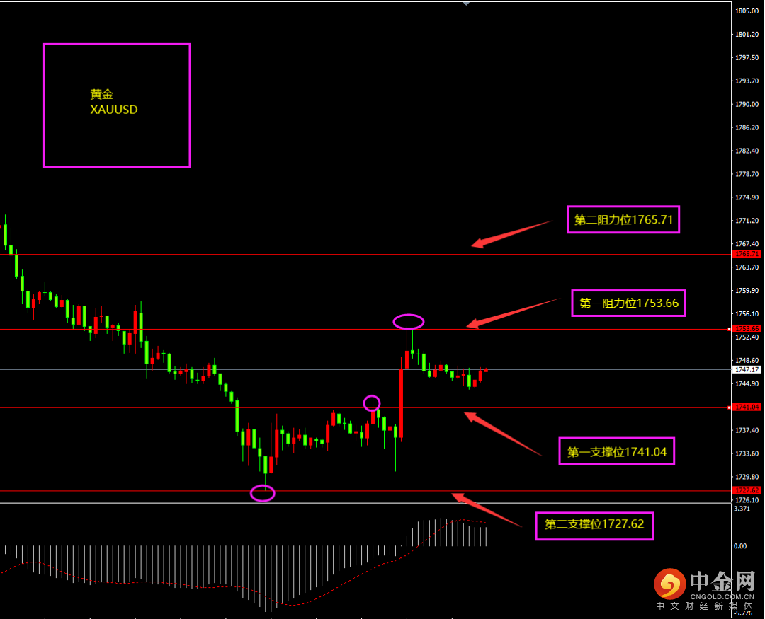 天图黄金收阳线,价格有所冲高,多头有所增强,短期结束连续下行,底部多头再度维稳,MACD并未大幅走弱,空头不强,日内更多以逢低看多为主。小时图黄金期间有大阳线筑底,MACD位于0轴之上,多头占优,短期上方虽有部分阴线产生,但更多视为调整,调整之后继续以逢低看多为主?