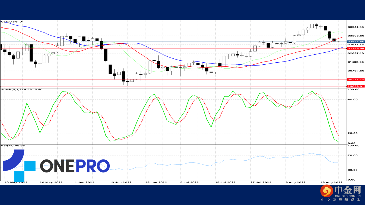 道琼指数的日线技术指标中,Alligator呈现黄金交叉,表示长线来看道琼指数呈现向上的趋势,短线KD指标已经走入低档钝化,表示短线回跌的力道颇强,虽然长线依旧处于多头格局,但长线布局投资者须谨慎等待回跌低点。