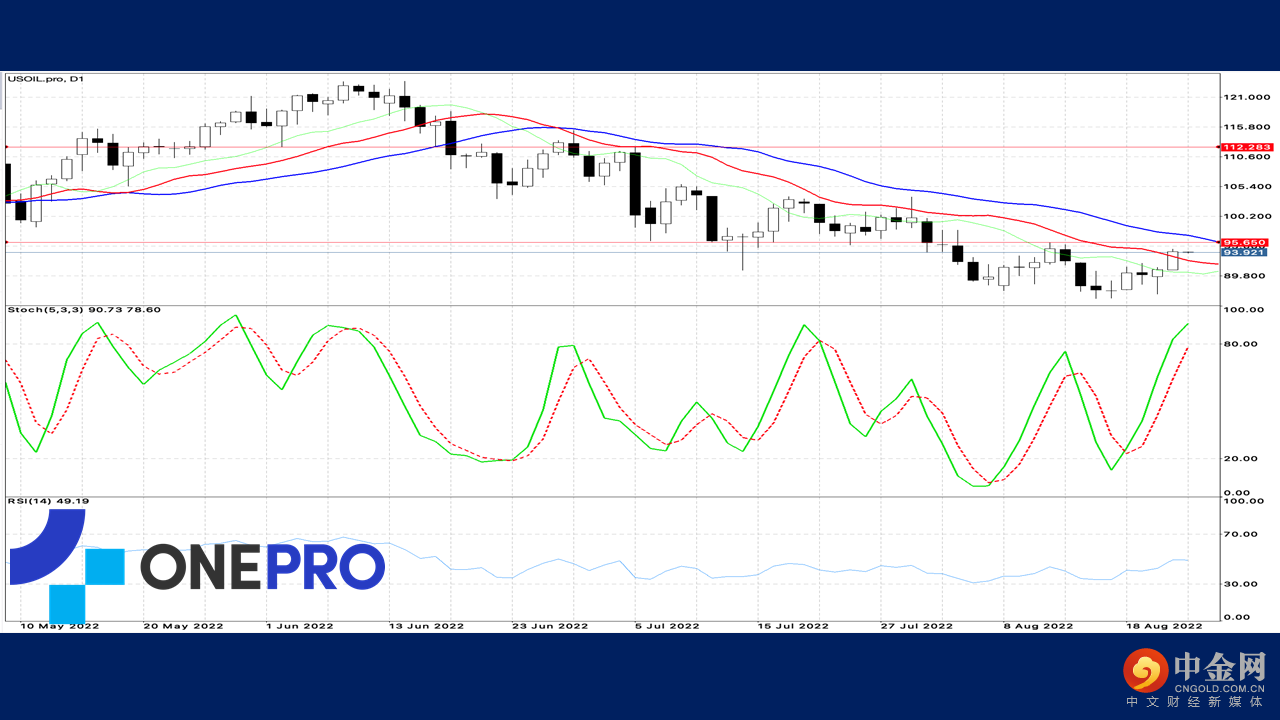 原油的日线技术线型中,长线Alligator呈现死亡交叉,表示长线原油的卖压较强,短线KD指标呈现高档钝化,表示短线有买盘加持,挑战前波高点的机会很高。