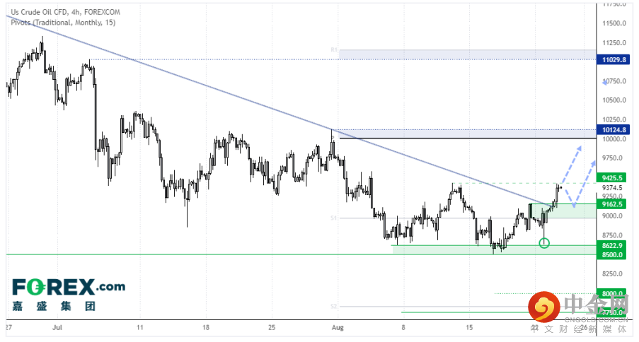 油价隔夜站上趋势阻力,与昨天的上涨趋势一致。油价在突破之前形成了上抬的低点,夯实85,000一线的支撑基础。油价突破后上方重点价位在10,000阻力区域。如果站上9,425,涨势延续可期,但我们也期待新的突破,所以可能在9,000上方寻找看涨结构。