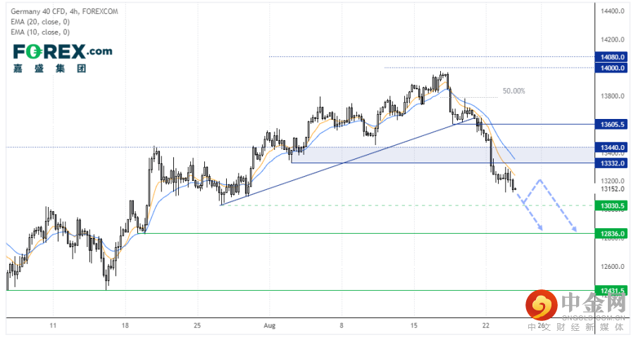 DAX上周突破趋势支撑后继续下跌。股指昨天在低点附近盘整,而且过去几个小时的动能已转为向下。逻辑上看,13,000支撑区域是空头的目标也是支撑位。但如果价格走低前先回调(可帮助提高风报比),则我们可能寻找昨天高点下方的看跌结构。下破13,000的话重点关注12,850。