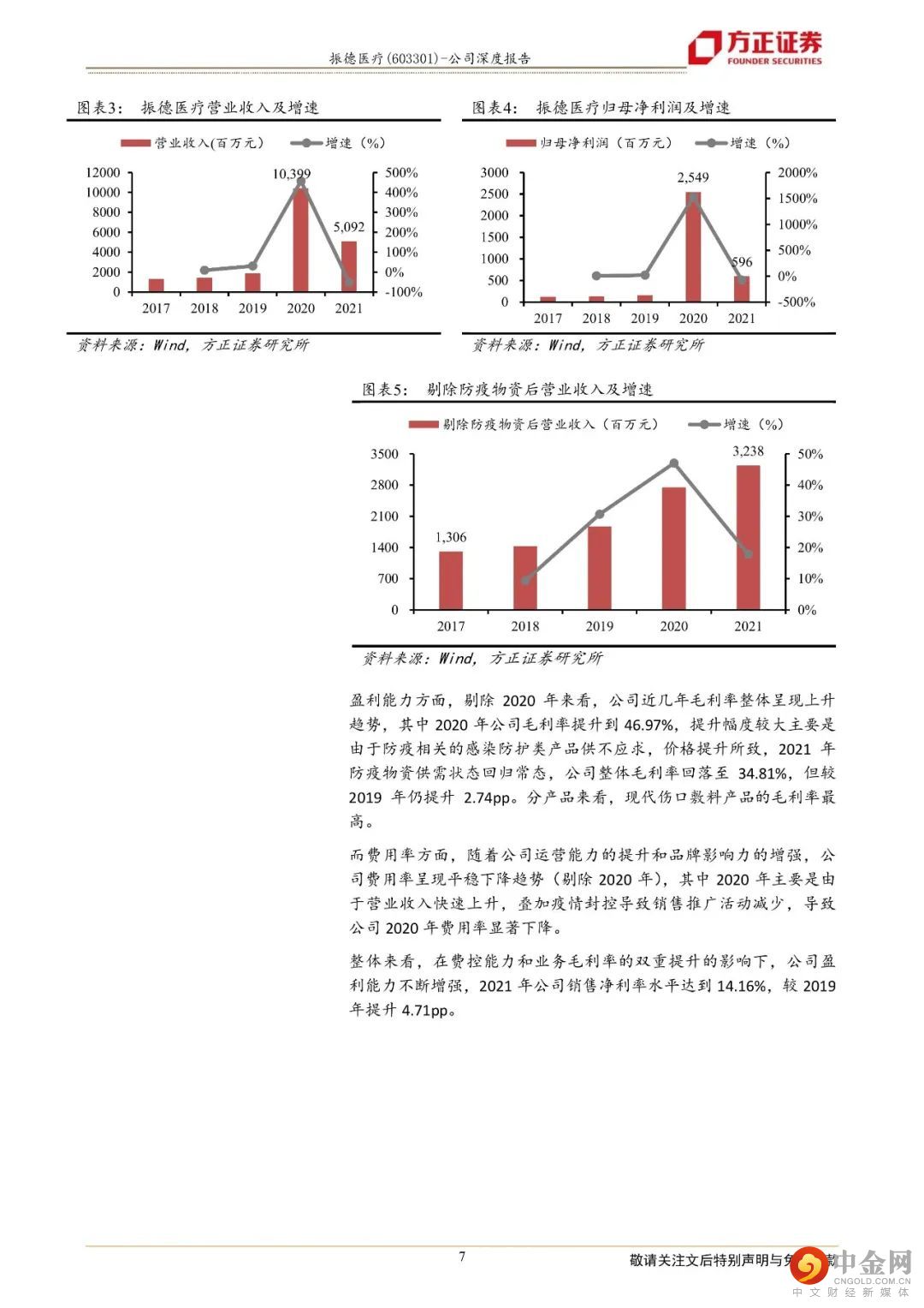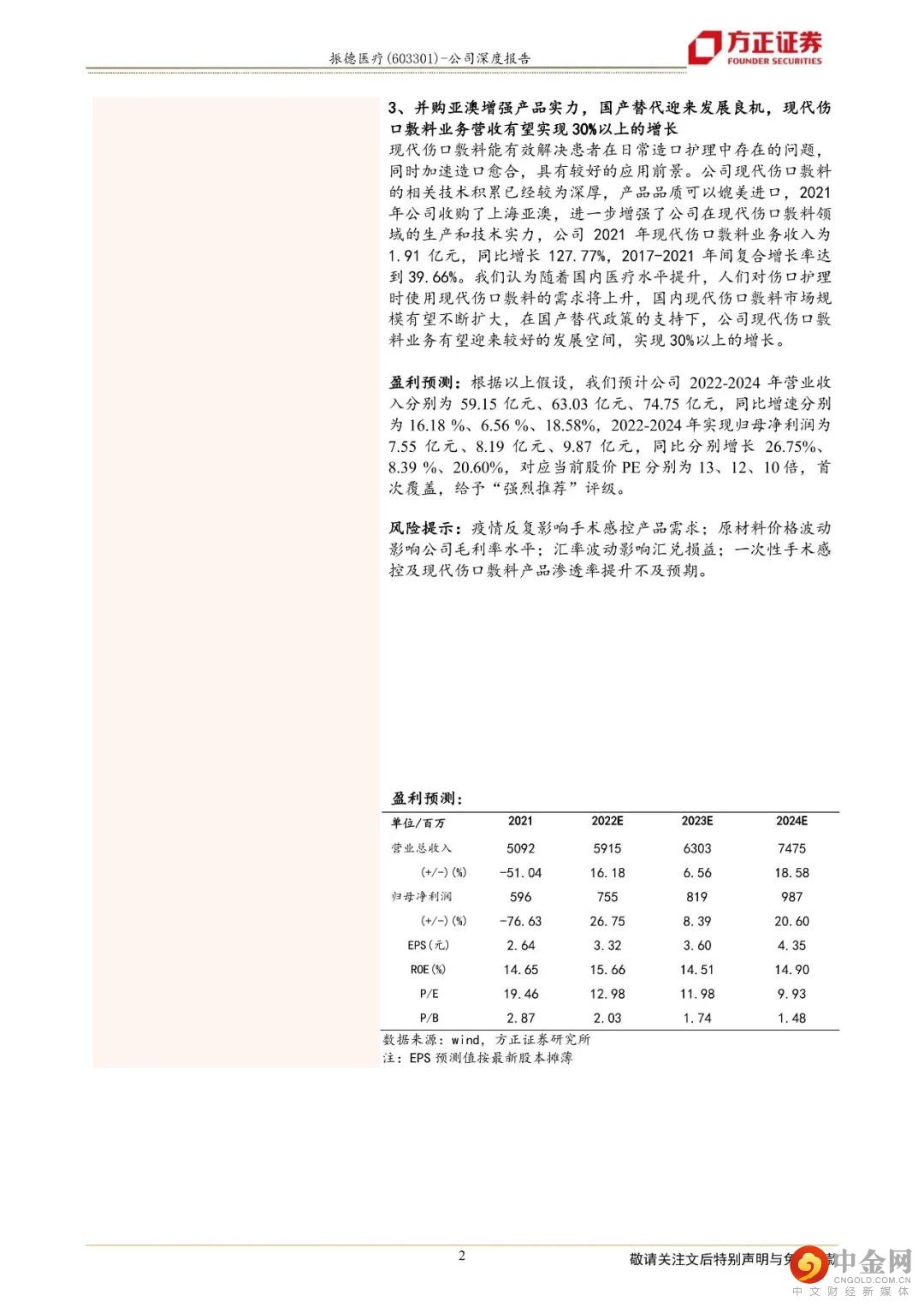 市场上认为振德医疗以OEM业务起家,技术及市场基础薄弱,且由于疫情期间口罩等防疫物资需求波动较大,业绩增长不具有持续性。而我们认为:①成长性方面,振德医疗经过多年的研发积累和市场布局,业务已经逐步从OEM转型到自主品牌,虽然疫情带来的防疫物资收入存在较大的波动,但是我们认为口罩等防疫物资的需求并不会断崖式消失,后疫情时代,防护需求将常态化,预计每个季度公司仍有1.5-2.5亿元的常态化防疫物资收入。②市场方面,疫情期间的防疫物资销售,除了给公司带来了较好的现金流之外,还助力公司提升了自有品牌的影响力,销售渠道显著拓宽,目前公司已覆盖全国6000多家医院,其中三甲医院数量超过900家,同时覆盖了9万多家百强连锁药店,覆盖率达到97%。③产品方面,疫情后期,我们认为“一次性手术感控产品”和“现代伤口敷料”将成为公司发展的两大主要驱动力,一方面,随着感控需求升级,一次性手术感控产品渗透率有望提升,公司手术感控产品布局完善,该业务有望迎来快速增长的局面。另外,现代伤口敷料产品随着产品力不断提升,有望在国产替代的春风下扬帆向前。我们主要的观点如下:1、深耕医疗护理领域,业务逐步实现从OEM到自主品牌的完美转型2、国内一次性产品渗透率提升空间大,公司手术感控产品布局完善,近年该业务营收有望实现20-30%的增长3、并购亚澳增强产品实力,国产替代迎来发展良机,现代伤口敷料业务营收有望实现30%以上的增长盈利预测:根据以上假设,我们预计公司2022-2024年营业收入分别为59.15亿元、63.03亿元、74.75亿元,同比增速分别为16.18 %、6.56 %、18.58%,2022-2024年实现归母净利润为7.55亿元、8.19亿元、9.87亿元,同比分别增长26.75%、8.39 %、20.60%,对应当前股价PE分别为13、12、10倍,首次覆盖,给予“强烈推荐”评级。风险提示:疫情反复影响手术感控产品需求;原材料价格波动影响公司毛利率水平;汇率波动影响汇兑损益;一次性手术感控及现代伤口敷料产品渗透率提升不及预期。