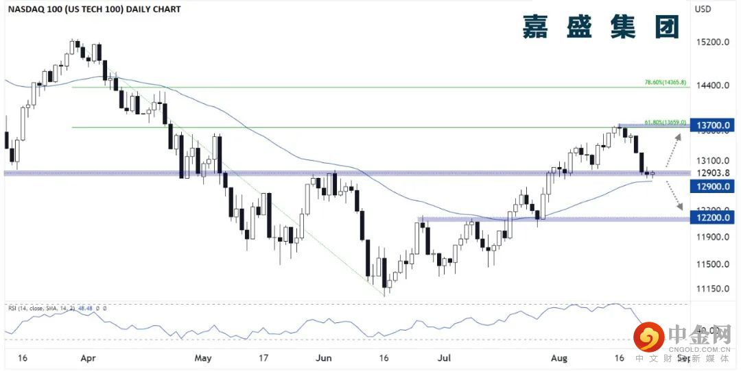 交易员的看法准确吗?这个问题要交给时间来回答。但鉴于其它风险资产走弱和鲍威尔讲话预期相对强硬,纳斯达克100指数9月如果迎来下破,可能也属于顺理成章。如果下破,需要关注的下个支撑位在12,200一线。